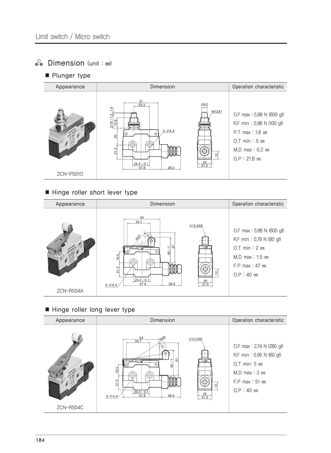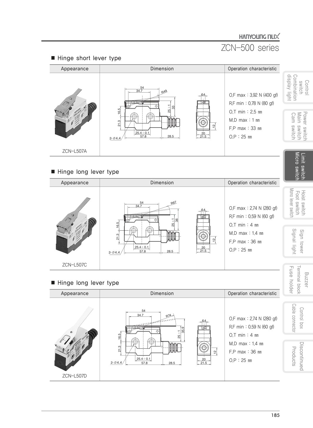 Catalogue ZCN-500 series (limit switch) của Hanyoung: đầy đủ thông số, kích thước và các kiểu cần (plunger, short/long roller lever…). Ảnh trang gốc rõ nét, tra cứu nhanh. Hàng chính hãng, CO-CQ, VAT; hỗ trợ báo giá.