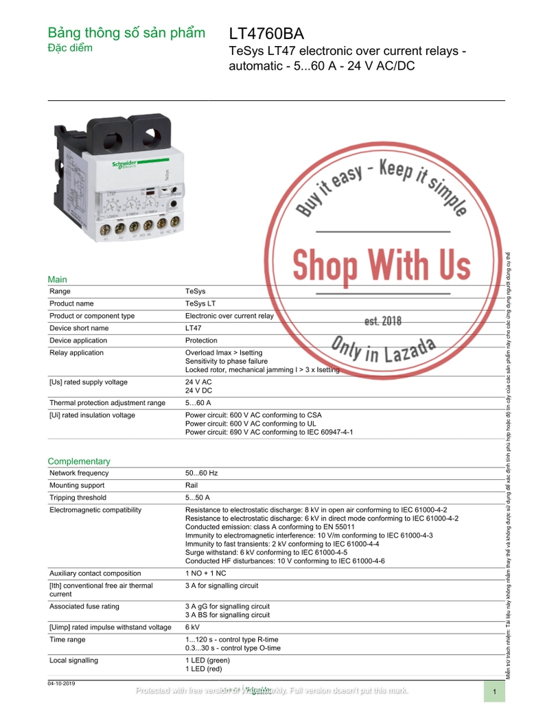 Tiếp điểm bảo vệ | 1 NO + 1 NC (Normally Open + Normally Closed) |