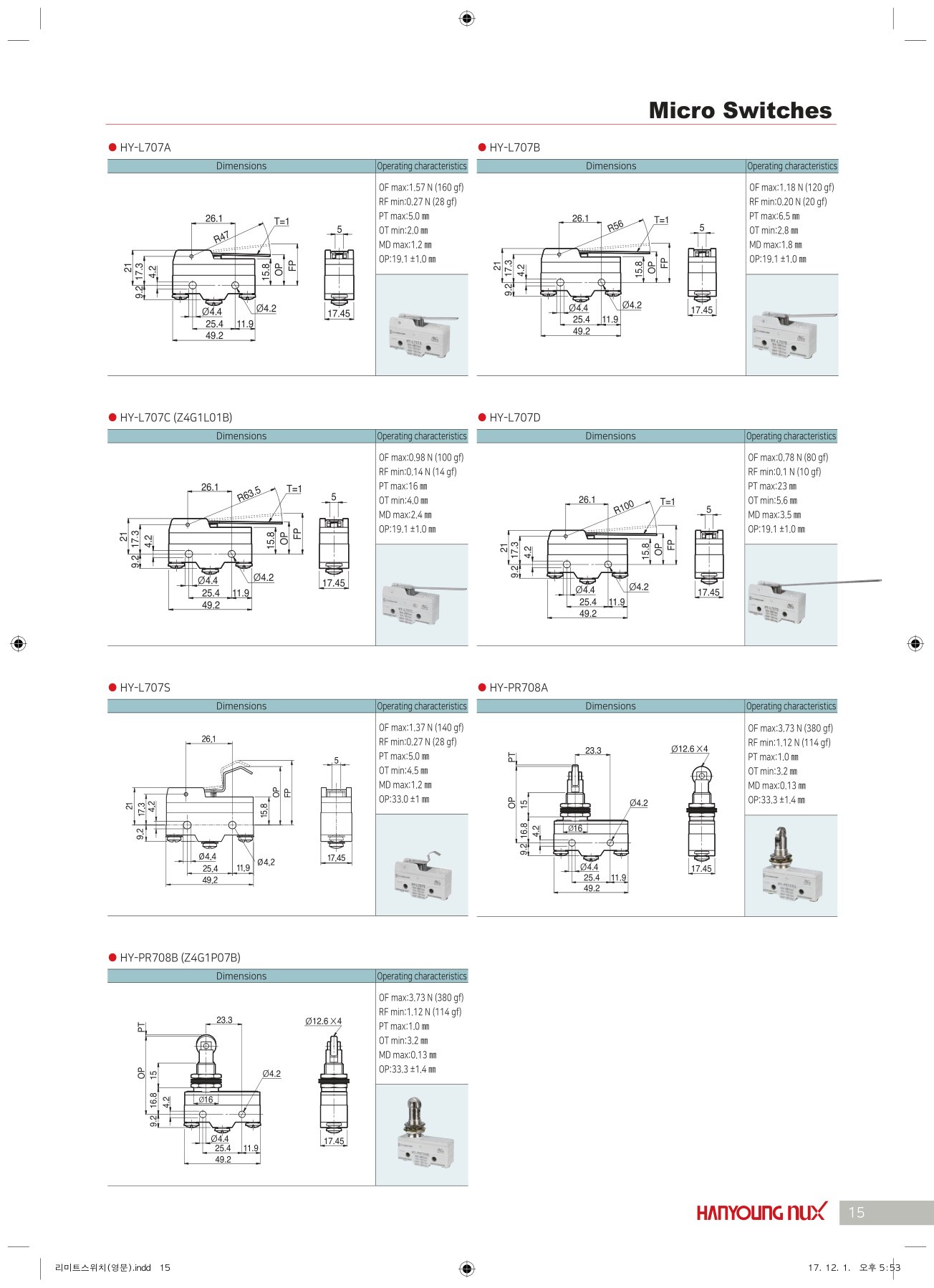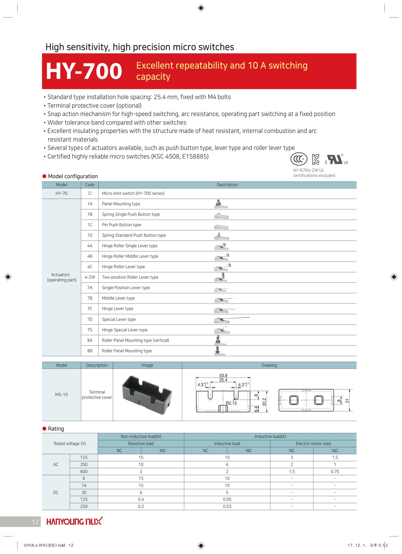 Catalogue Micro Limit Switch HY-700 (Hanyoung NUX): đầy đủ thông số tải AC/DC, kích thước, các kiểu cần (push, lever, roller) và đặc tính vận hành. Ảnh/PDF rõ nét, CO-CQ, VAT; hỗ trợ báo giá nhanh.